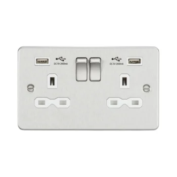 Knightsbridge Flat Plate 13A 1G Switched Socket with Dual USB Charger (2.1A) – Brushed Chrome with White Insert