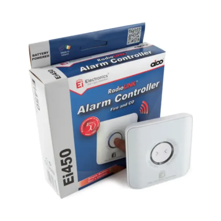 The Aico Ei450 RadioLINK Alarm Controller provides centralised control of smoke, heat, and carbon monoxide alarms. It features a wire-free design, a 10-year lithium battery.