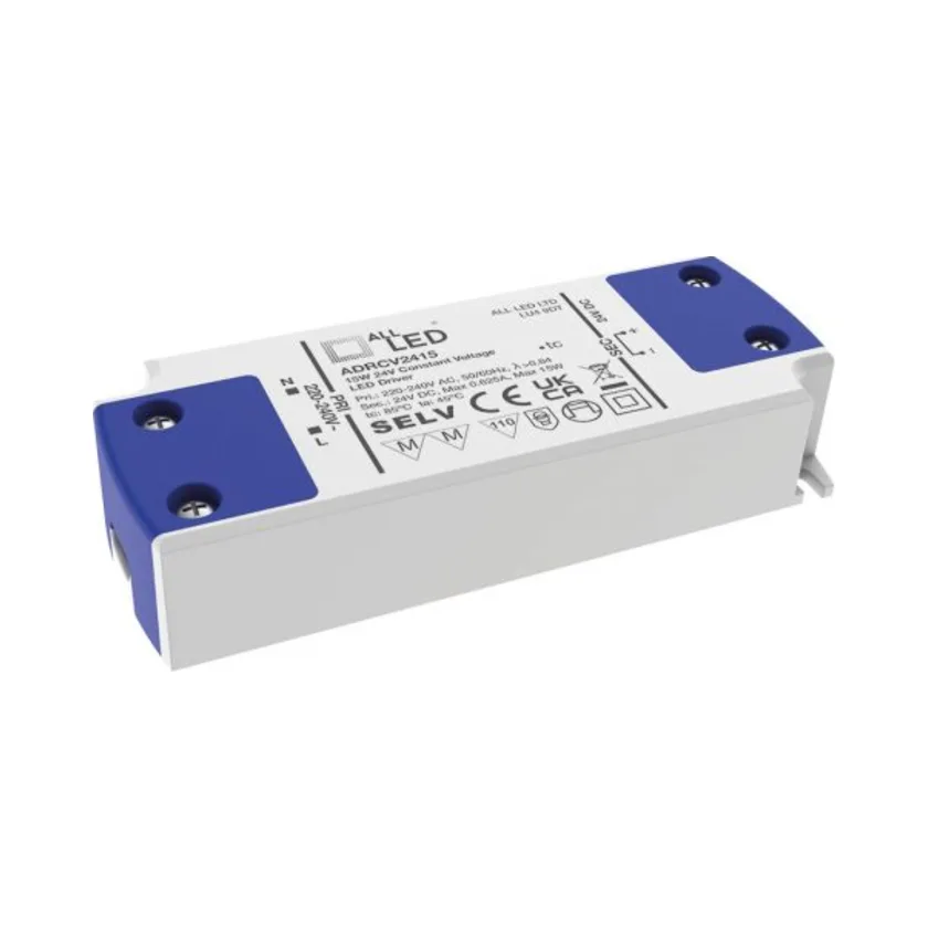 The ALL LED Drive24 24V DC Constant Voltage LED Drivers 15W is a simple and reliable solution for constant voltage LED lighting. It is designed to provide a steady power supply, ensuring your LED lights perform consistently. With a durable body and key safety features, it is perfect for both homes and businesses.