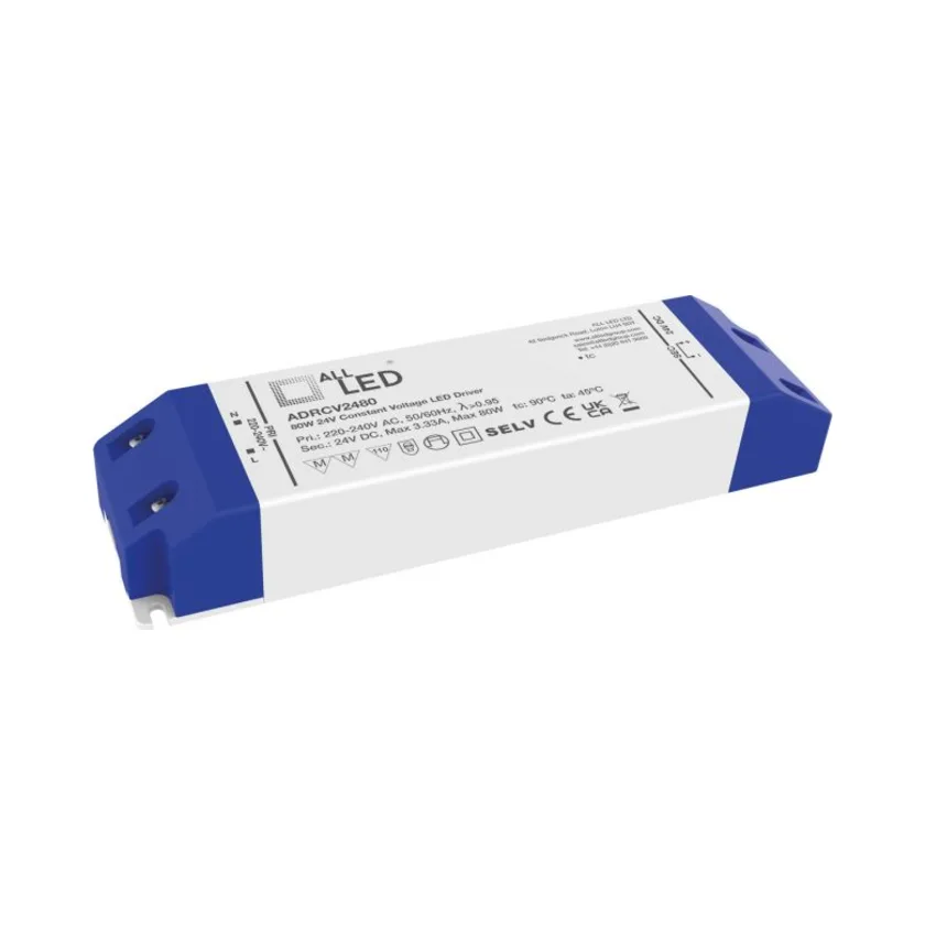 The ALL LED Drive24 24V DC Constant Voltage LED Driver 80W provides reliable power for constant voltage LED systems. Built with a sturdy polycarbonate body, it ensures durability and protection. Designed for non-dimmable applications, this driver delivers consistent performance while safeguarding your LEDs with advanced protection features.