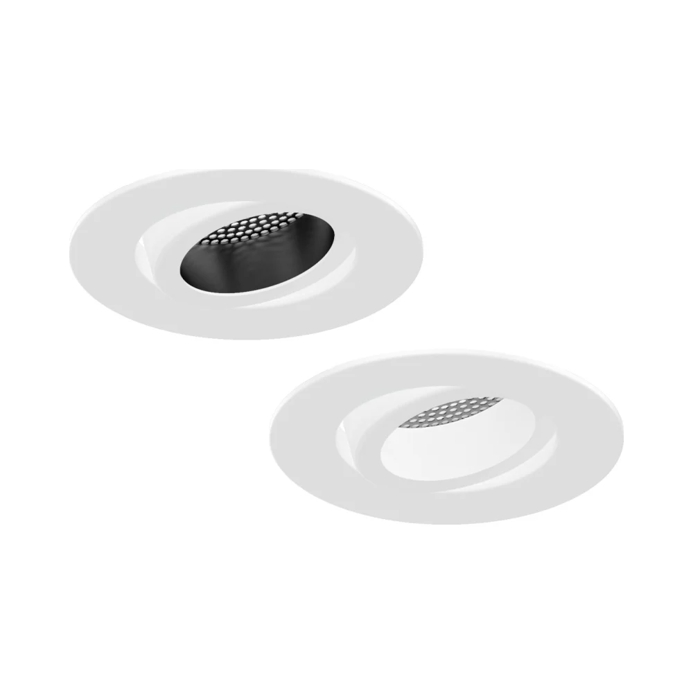 The ALL LED AFDP75BZ/A/WH Polar White Adjustable Bezel is specifically designed for the iCan75 Platinum downlight range, combining functionality and sleek aesthetics. Its twist-and-lock mechanism ensures a quick and secure installation, while the adjustable design allows for precise directional lighting with a 15˚ tilt and 150˚ horizontal rotation. This bezel includes both black and white anti-glare baffles, providing flexibility in achieving the desired lighting ambiance and style. The optional IP-rated glass cover enhances protection, making it suitable for various environments.