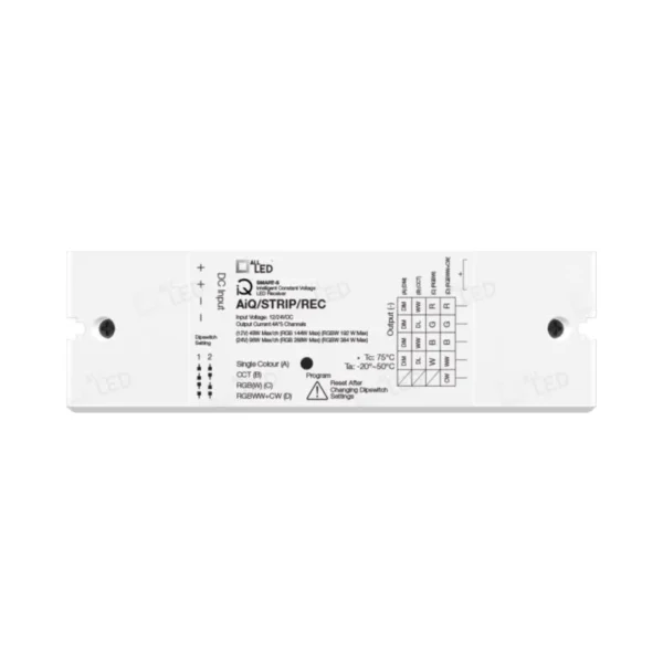 The AIQ/STRIP/REC iQ Smart-S LED Strip Controller offers a flexible and advanced solution for managing various LED lighting systems. It integrates seamlessly with Zigbee smart hubs, supporting dimming and multiple LED configurations, including single-colour, Trilogy-CCT, RGB, RGBW, and RGBWW+CW.