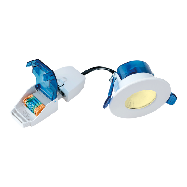 Fire rated 5.5W LED downlight with warm 3000K light, FastRFix connector, IP65 bezel and CRI90. Designed for shallow ceilings and bathroom use.