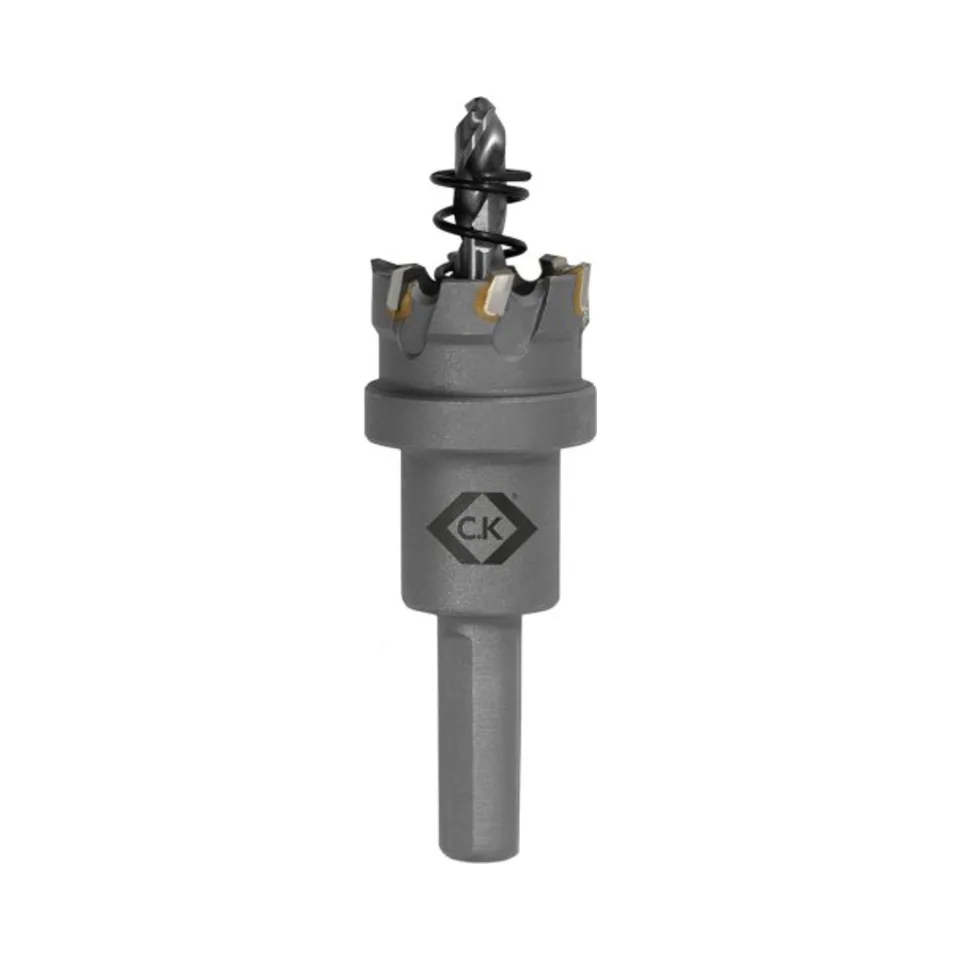 The C.K T3203 020 TCT Hole Saw by C.K Tools features a Tungsten Carbide Tip for cutting through steel, cast iron, and copper, with a high-tension spring for quick slug ejection. Suitable for materials up to 12mm thick.