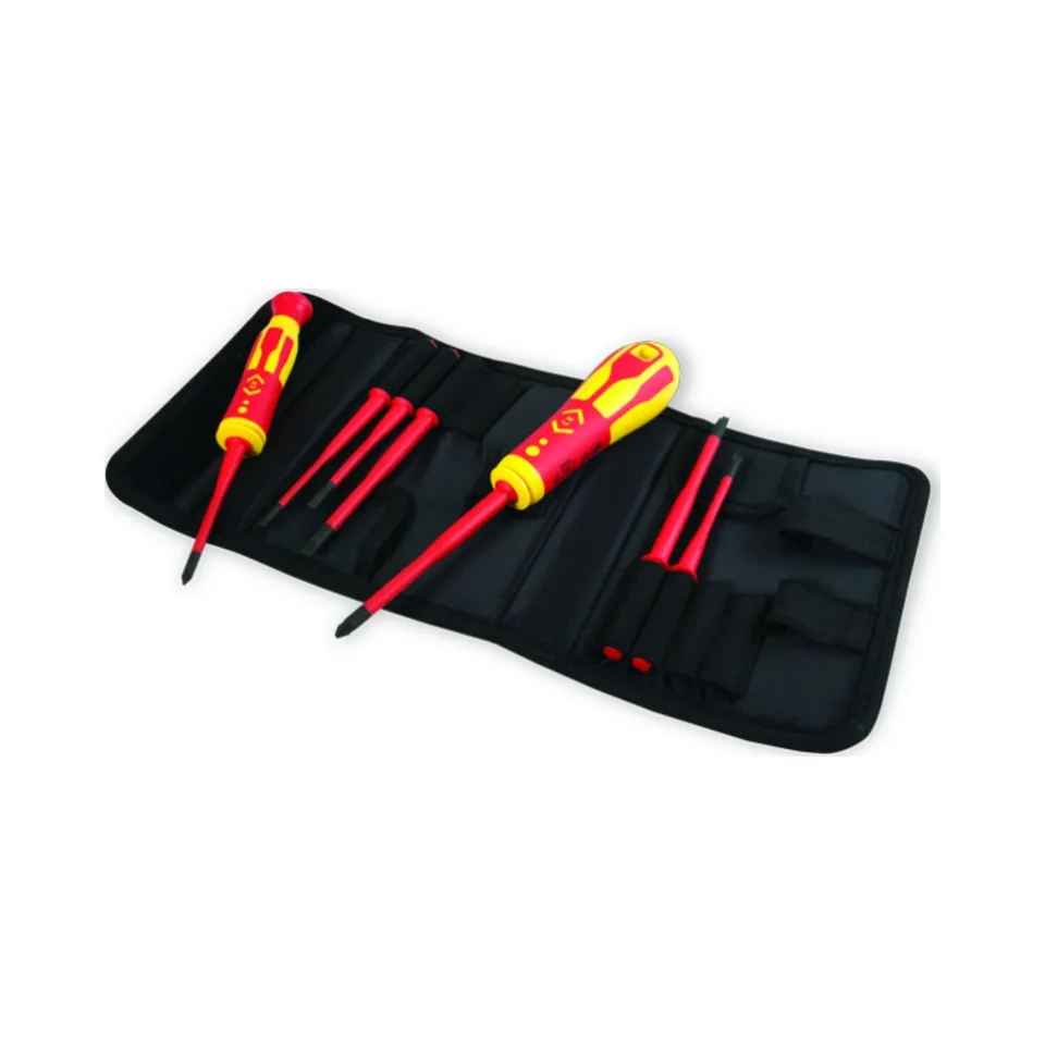 The C.K Tools T4925 VDE Screwdriver Set offers an essential, high-quality selection of slim interchangeable blades, each VDE-tested to 1000V, ensuring reliable safety and precision for electrical work. The set includes a range of sizes suited to various applications and is conveniently packaged in a fabric storage pouch for easy organization and portability.