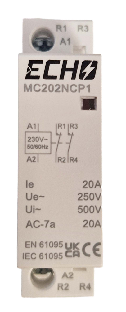 20A 2NC 230V AC modular contactor in 1 module width. Ideal for reliable high-power circuit control in commercial and industrial installations.