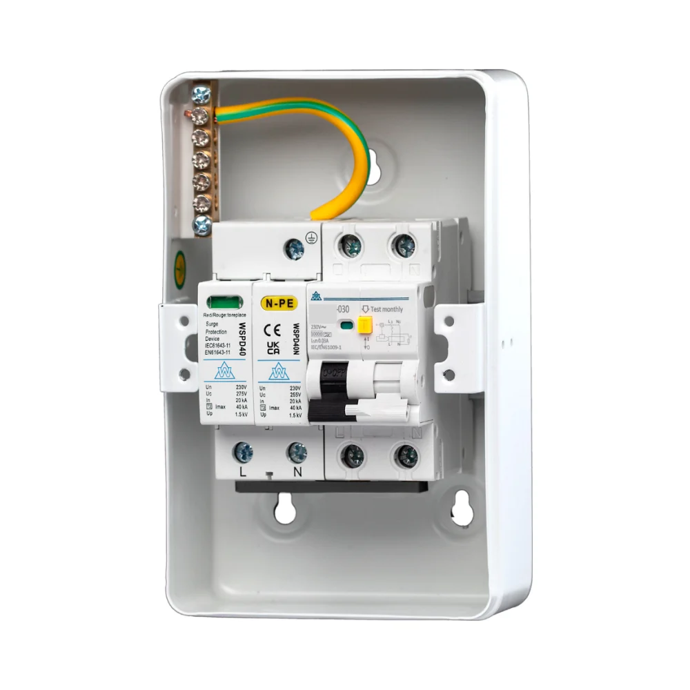 Protect your electric vehicle (EV) charging setup with the WCED WMRC40CSP EV Consumer Unit, a purpose-built solution designed for optimal safety, performance, and durability. This advanced unit combines an A Type DP C40 RCBO with an integrated Surge Protection Device (SPD), ensuring your EV charging infrastructure is well-guarded against faults and power surges.