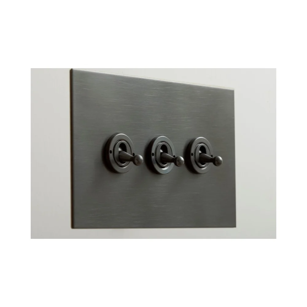 The Forbes & Lomax 3 Gang 2 Way Dolly Switch in antique bronze combines vintage elegance with versatile control over three circuits, ideal for enhancing larger spaces.