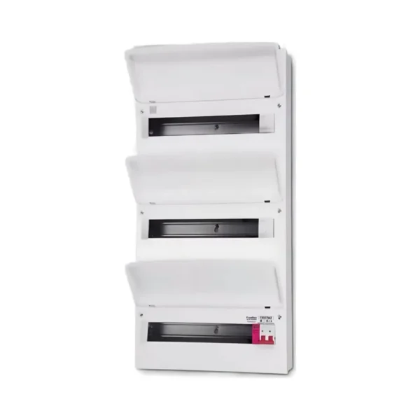 The FuseBox F3047MZ RCBO SPD Consumer Unit is the biggest model in the F3 range. It is made for large homes or small commercial sites. This unit offers 47 usable ways split across three DIN rails. The triple-row layout helps keep wiring neat and makes installation more flexible.