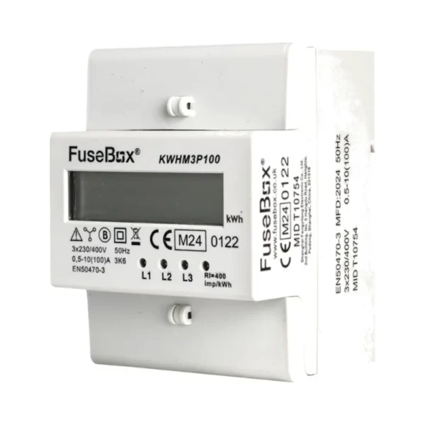 The FuseBox KWHM3P100 Three Phase kWh Energy Meter offers precise energy measurement for domestic, commercial, and industrial installations. This MID-certified meter supports up to 100A direct connection, providing reliable tracking of power consumption across three-phase circuits.
