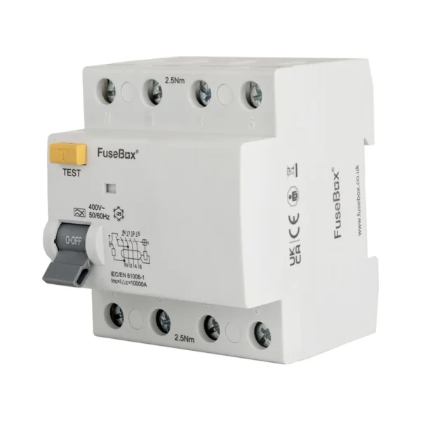 The FuseBox RTA1001004S is a 4-pole, 100A Type A RCD with a 100mA trip level, designed for optimal safety and reliability. This Residual Current Device (RCD) ensures rapid circuit disconnection in the event of earth faults, providing vital protection in residential, commercial, and industrial settings. Engineered for durability, it meets IEC/EN 61008-1 standards, offering dependable performance and peace of mind.