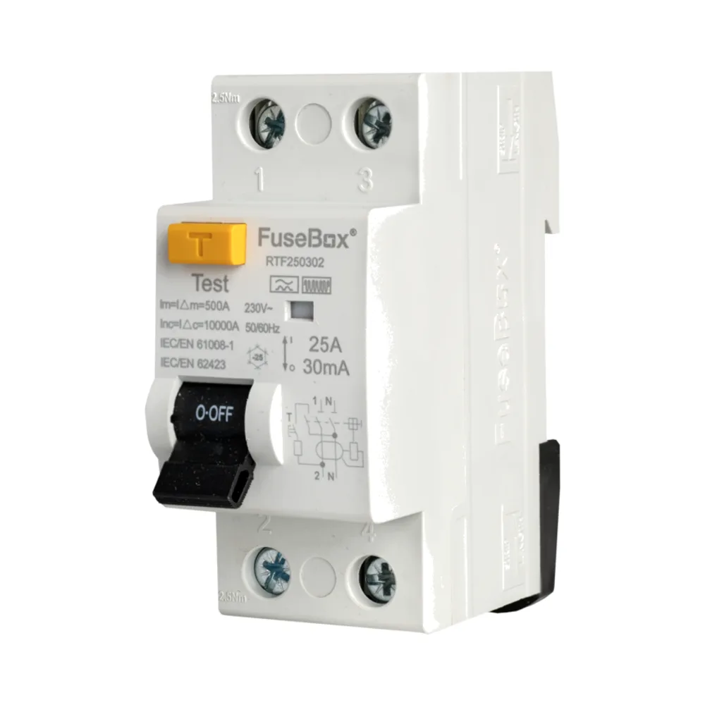 The FuseBox TYPE F RCD 25A 30mA 2P (RTF250302) delivers advanced protection for modern electrical systems. It is ideal for circuits that use equipment with frequency inverters, such as power tools, heat pumps, and other household appliances. Type F RCDs can detect both AC and pulsating DC currents, which standard Type A or AC RCDs cannot handle effectively.