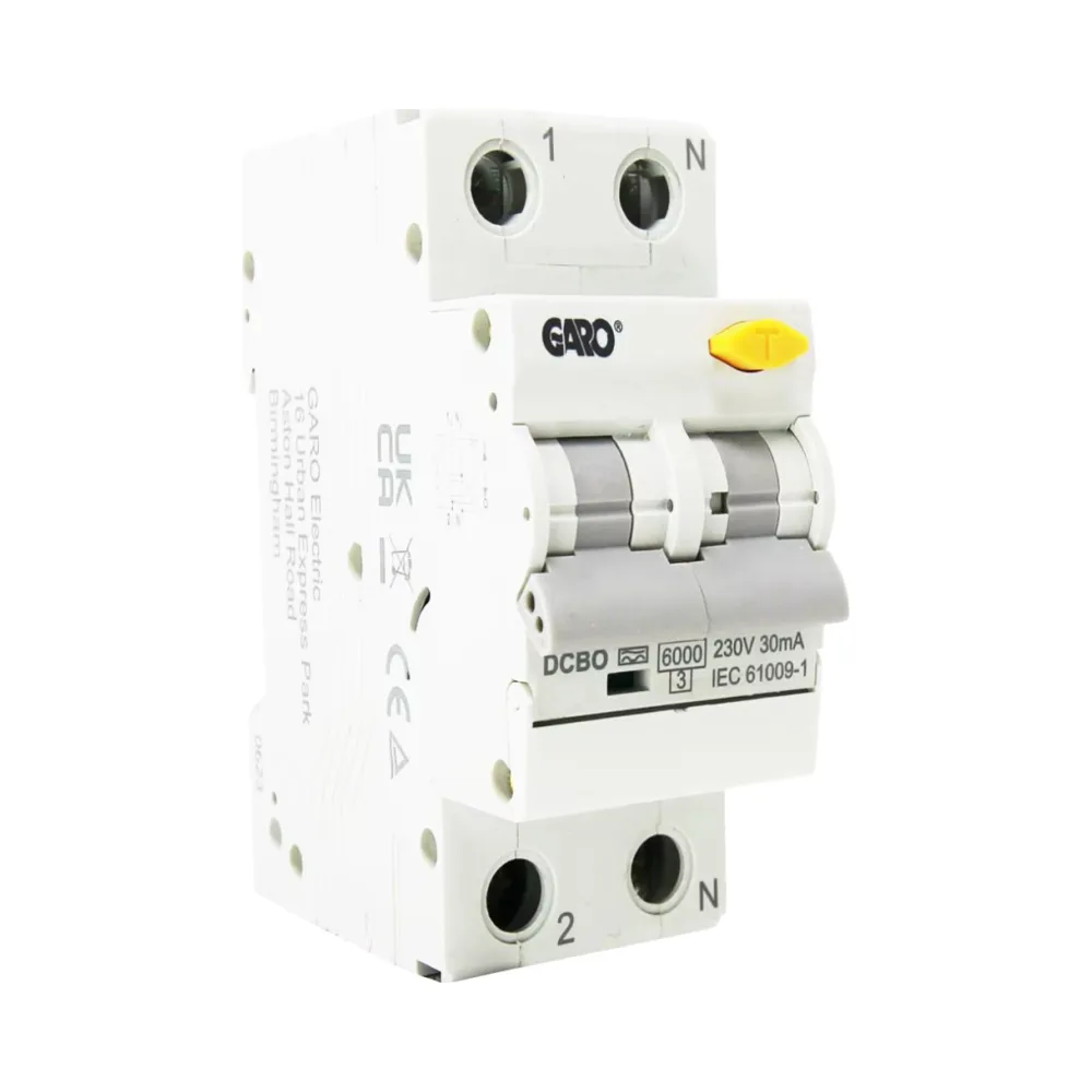 The Garo C Curve RCBO is a DIN rail-mounted breaker designed for safe disconnection and fault detection. It supports 6kA fault current and Type A residual protection to detect both AC and pulsating DC leakage.