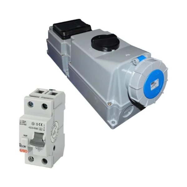 - For 400V connections, explore the 63A 4-pin three phase socket with RCCB and interlock.