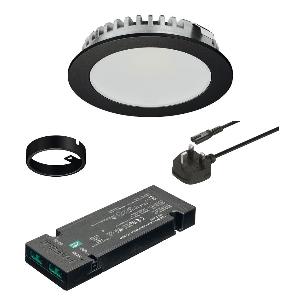 The Hafele 833.87.584 Loox5 3000K Spot Light Kit is a complete 24V IP20 recessed LED lighting solution designed for display cabinets, shelving and furniture applications. Finished in black, it delivers a 3000K warm white output with uniform illumination. Featuring Ø65mm fittings with a 58mm cut-out and minimum 13.5mm installation depth, this kit includes 3 spot lights, driver, mains lead and bezels for surface mounting.