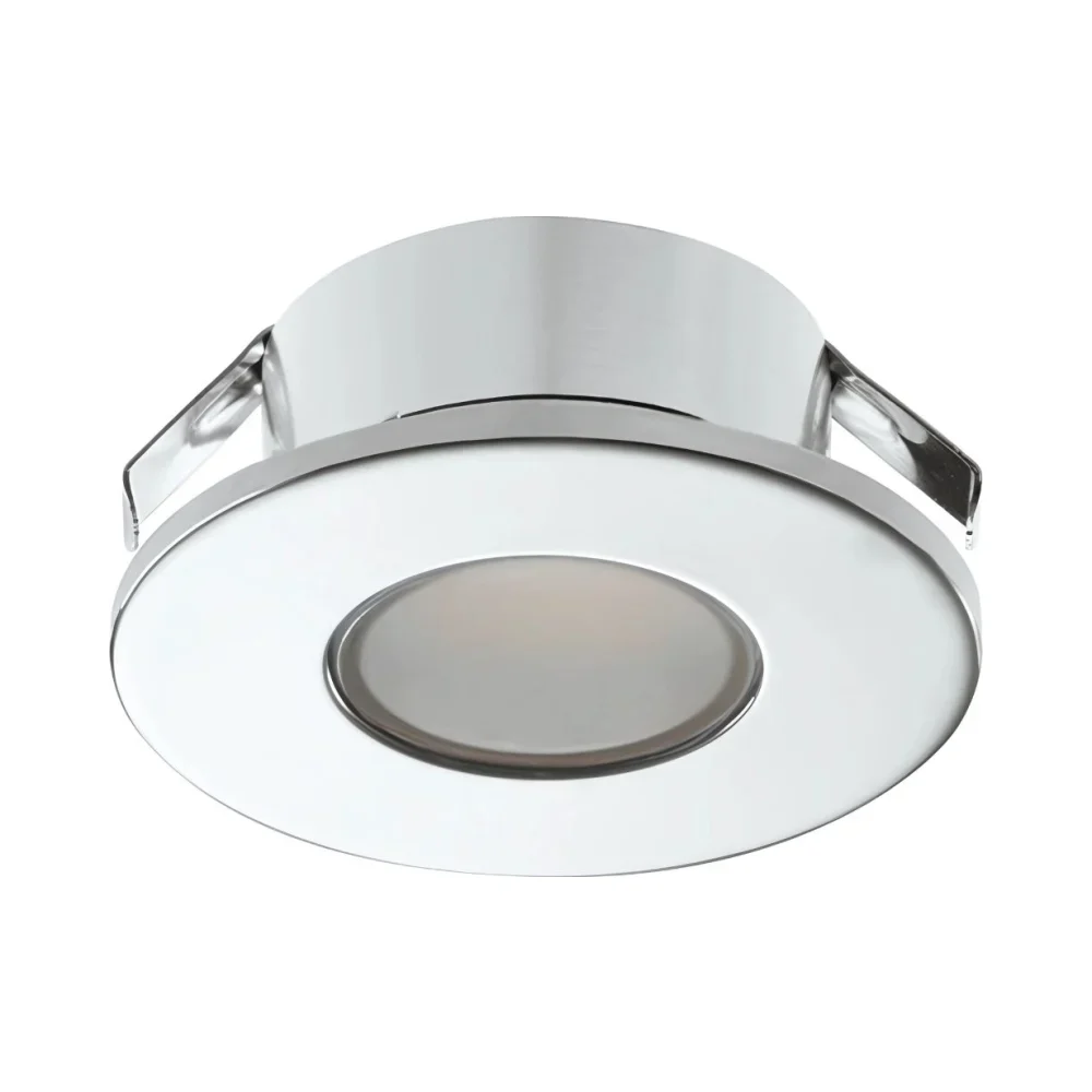 Compact 12V LED spot light with a chrome finish and 3000K warm white glow, IP44 rated when recessed. Ideal for bathrooms, furniture, or display units with flexible mounting options and dimmable performance.