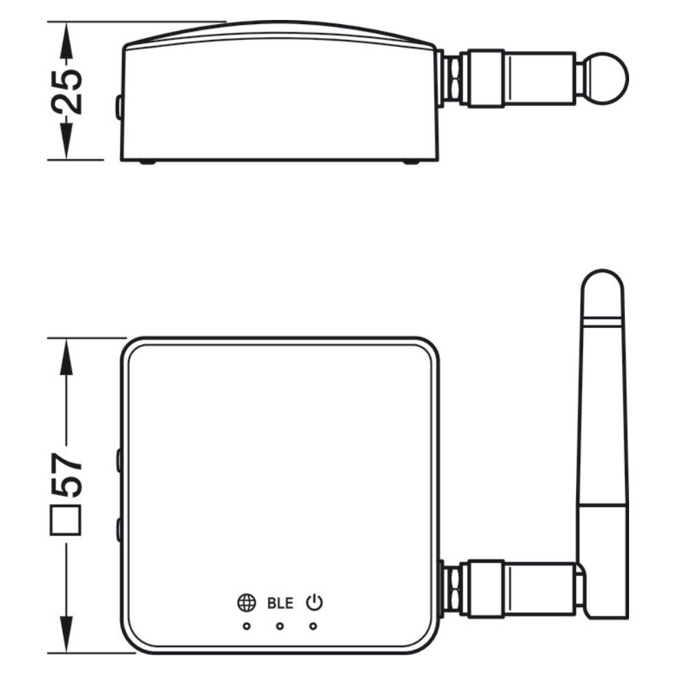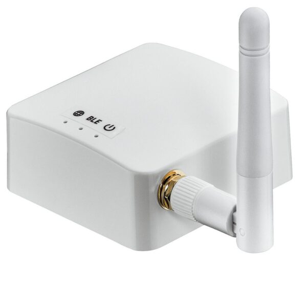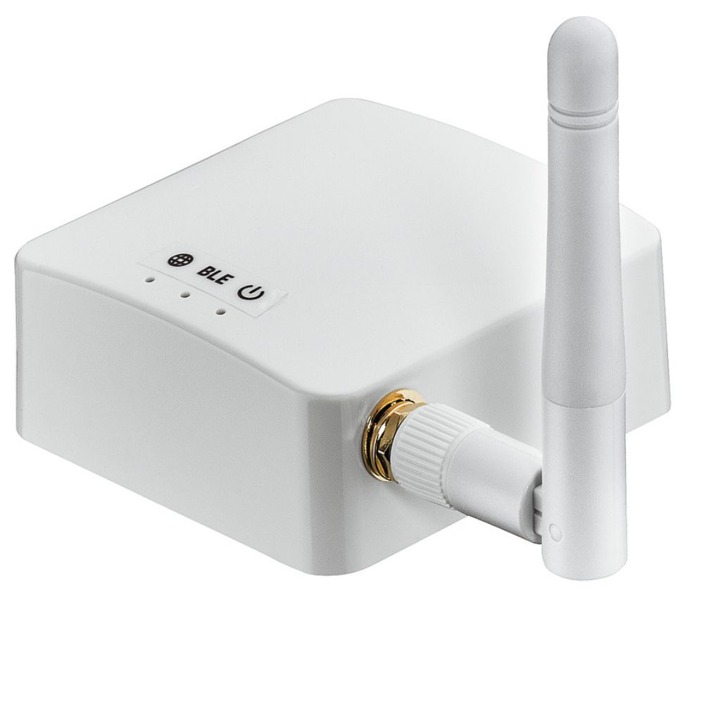 The Hafele 850.00.074 gateway uses WiFi and Bluetooth communication to connect lighting components and smart home services. The device includes an external antenna for reliable signal performance.