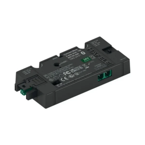 The Häfele 850.00.846 Loox5 2-Way Distributor with Connect Mesh is a smart and powerful control module designed for multi-white lighting setups. It enables wireless Bluetooth control, manual switch input, and programmable light behaviour across two synchronised output ports. Part of the Loox5 24V system, it provides an easy way to control on/off, dimming (0–100%), and colour temperature changes via app or compatible switch.