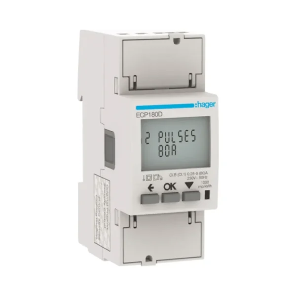 The Hager ECP180D is a 1-phase 80A kWh meter with S0 pulse output, offering precise energy measurement, a retro-illuminated display, and MID certification.