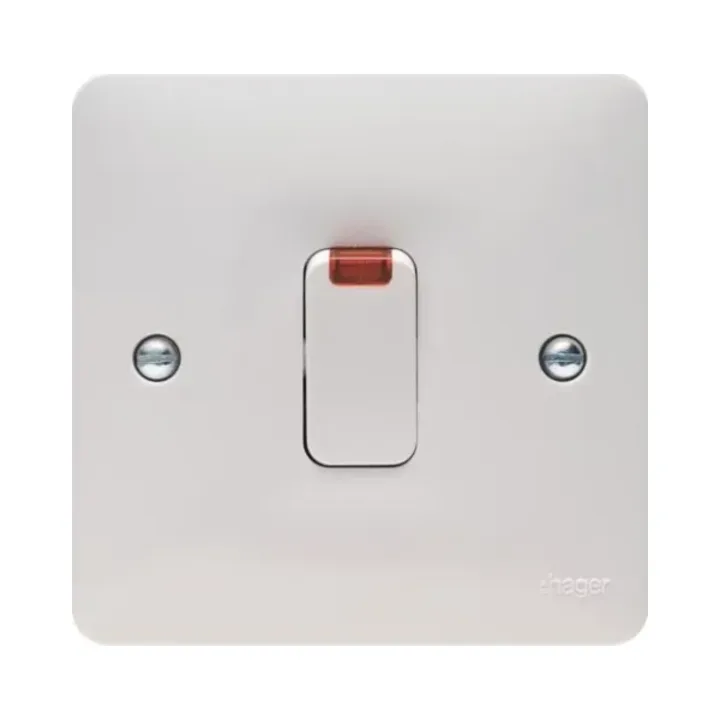 The Hager Sollysta WMDP84N is a 20A Double Pole Switch with a neon indicator. It offers easy installation and reliable performance. This switch meets BS EN 60669-1 standards, features upward-facing terminals, and includes fixing screws for secure installation. It is an ideal choice for enhancing both safety and visibility in electrical setups.
