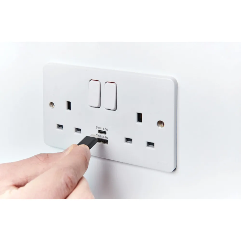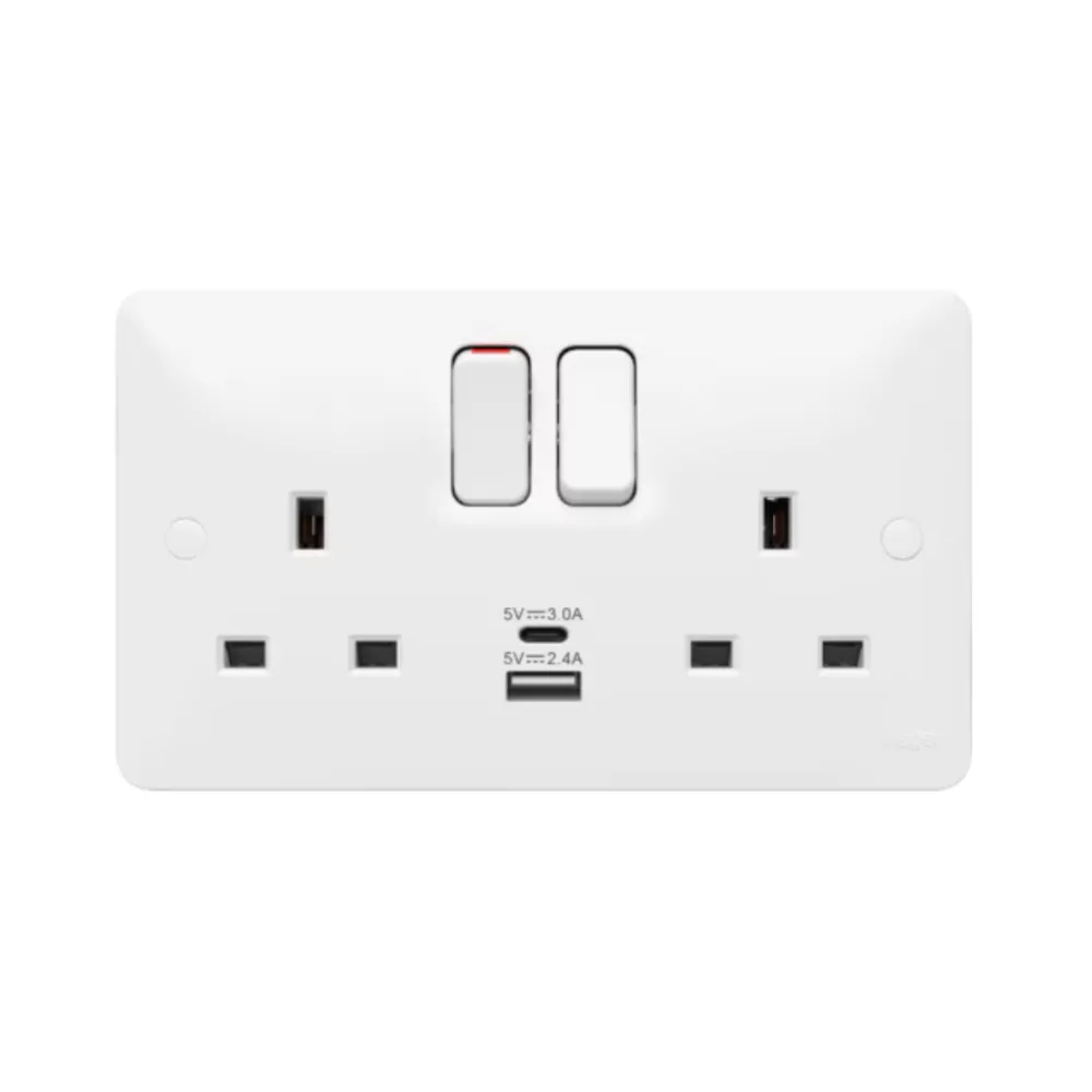 The Hager Sollysta WMSS82-USBAC 2 Gang Switched Socket with USB (A+C) ports combines advanced safety features with convenient USB charging capabilities for modern electrical setups.