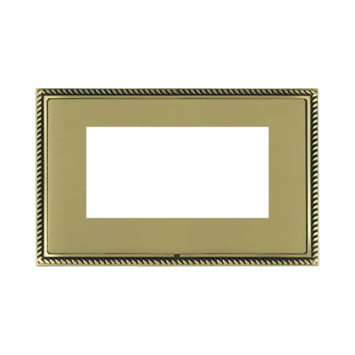 The Hamilton LGXEURO4AB-SB Linea-Georgian CFX 4-Module EuroFix Aperture Plate combines a sophisticated antique brass frame with a satin brass plate, offering style and adaptability. Designed with a 100x50mm aperture, this plate provides compatibility with a variety of Euro modules, making it perfect for customized setups in residential or commercial spaces.
