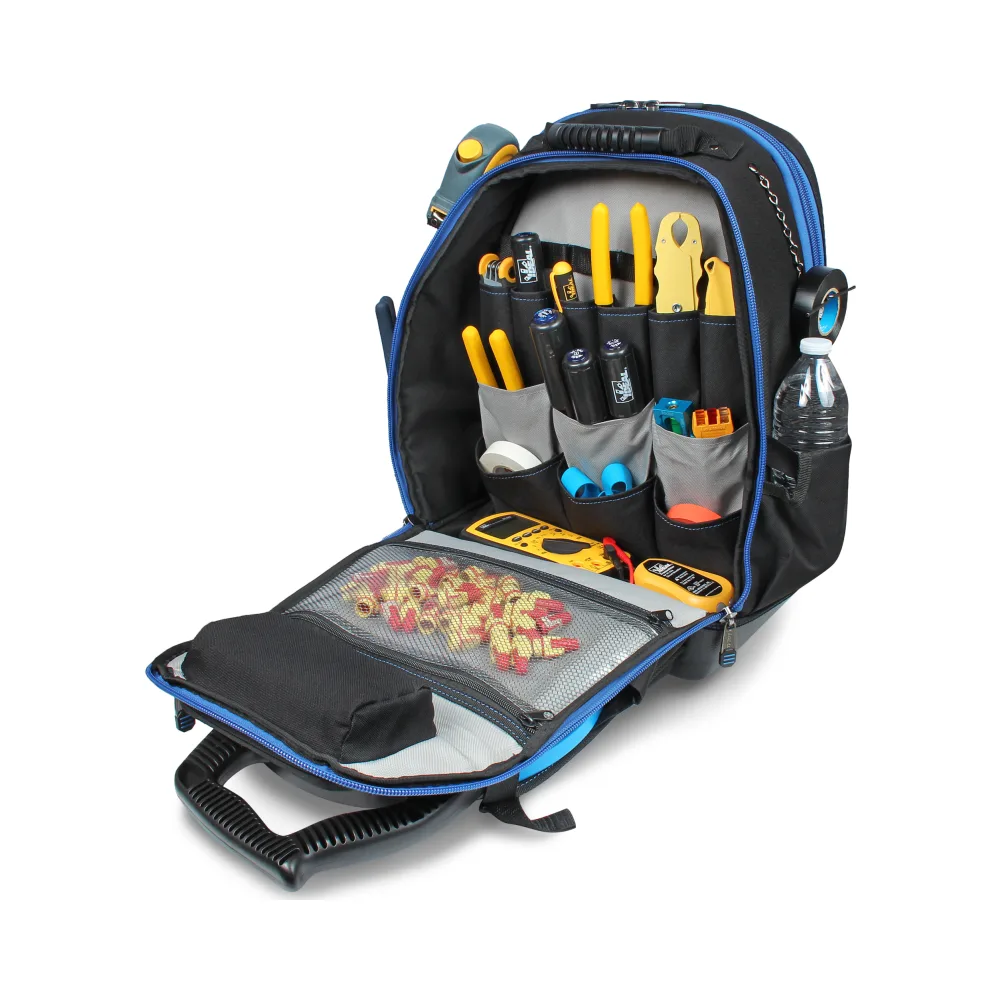 The IDEAL 37-000 Pro Series Dual Compartment Tool Backpack is a rugged and versatile tool storage solution, featuring 18 pockets, a drill holster, a protective phone/glasses case, a removable tool pouch, and dedicated laptop/tablet space. Its lay-flat opening design, moulded bottom, and padded straps make it the perfect backpack for electricians, engineers, and tradespeople working in demanding environments.