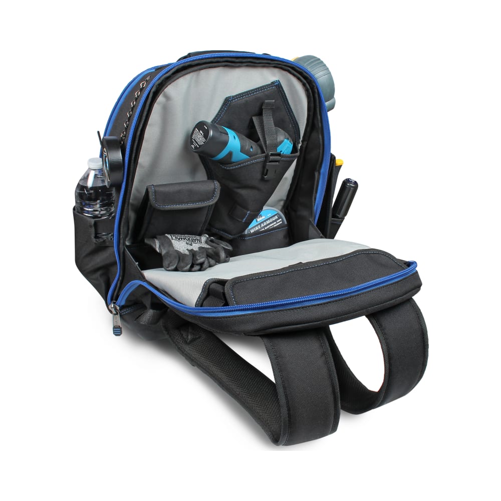 - Exterior Storage: Large front pocket, water bottle holder, tape measure clip, and fish tape slot