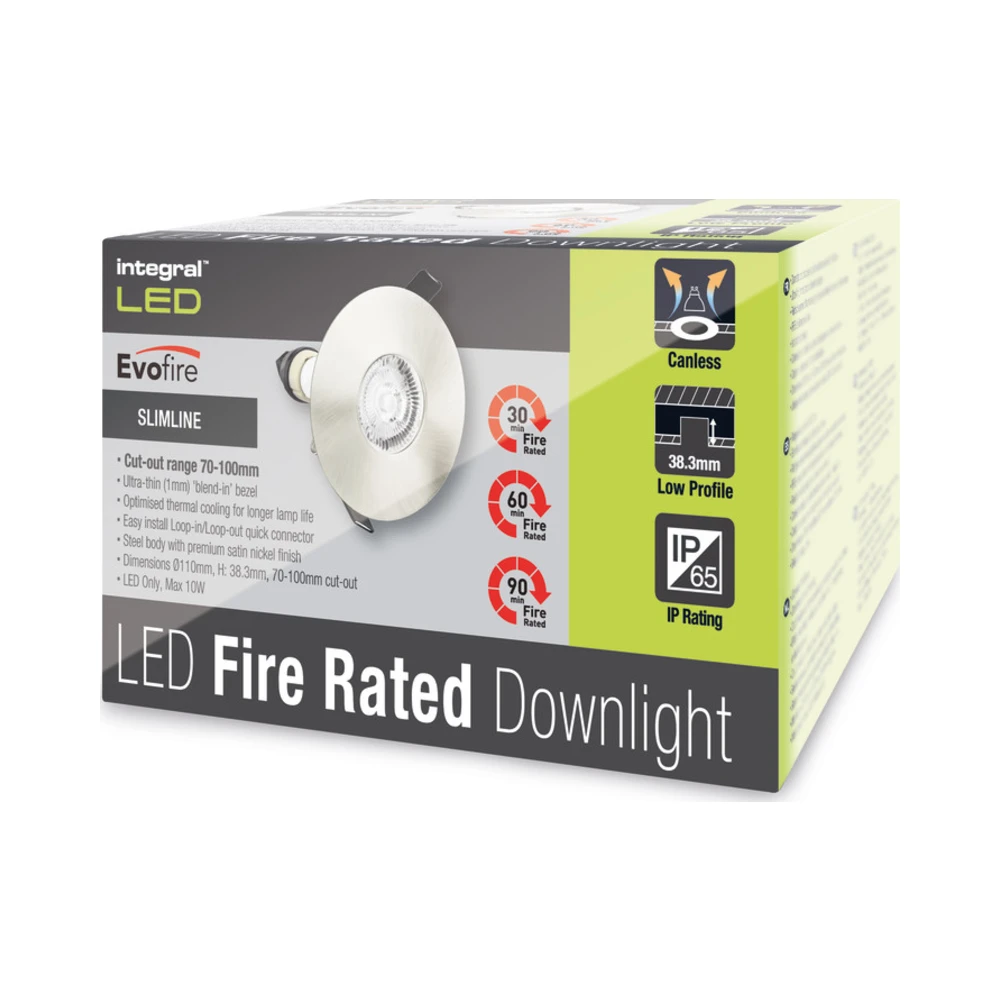 The Integral Evofire Fire Rated IP65 LED GU10 Downlight in satin nickel is a stylish and practical lighting solution designed for both residential and commercial spaces. Featuring an ultra-thin 1mm blend-in bezel, this downlight offers a seamless, flush finish that enhances any interior.