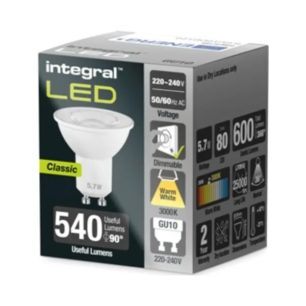 Key Features of Integral ILGU10DD120 Dimmable 3000K LED GU10 Lamp