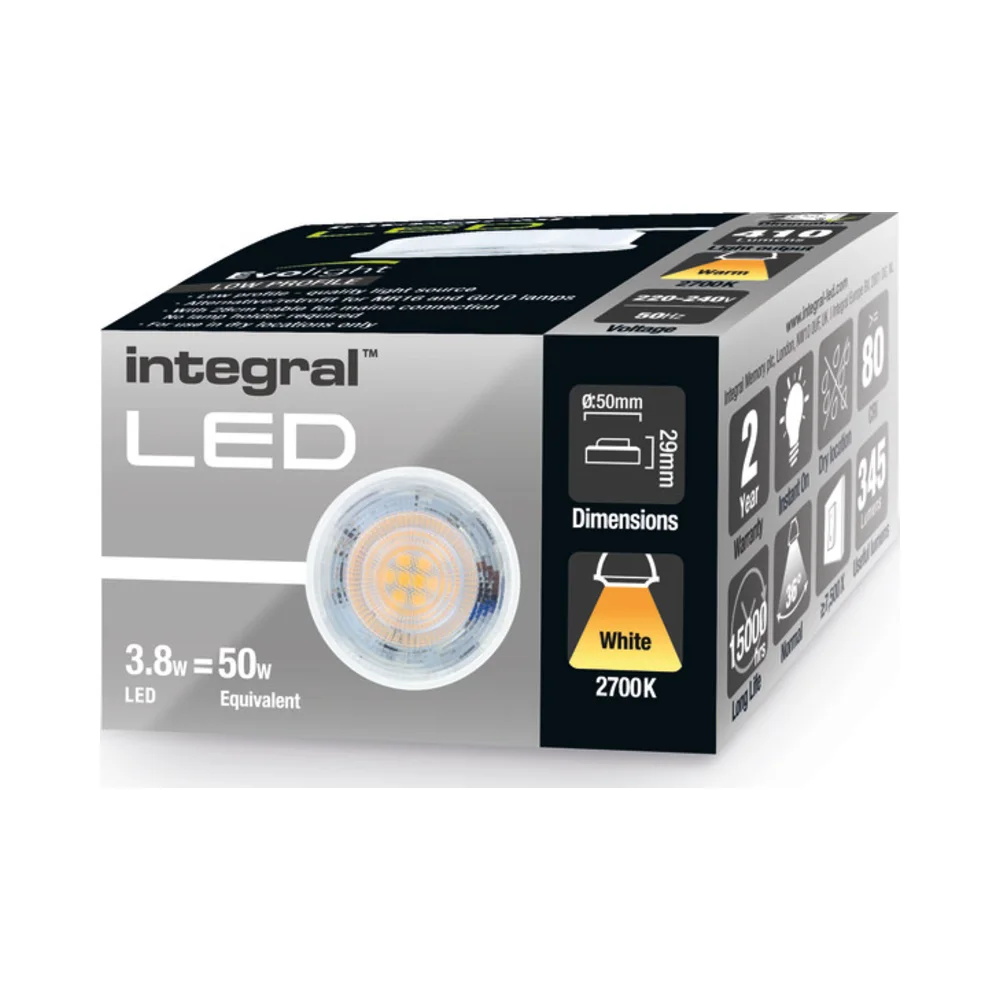 The Integral ILMDC001 Evolight Dimmable LED Lamp is an innovative lighting solution that simplifies installation while delivering high-quality warm white illumination. This pre-wired 240V lamp replaces traditional 12V MR16 and 240V GU10 lamps, eliminating the need for lamp holders or transformers.