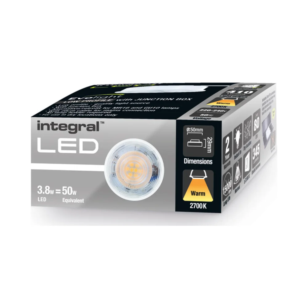 The Integral ILMDC003 Evolight Dimmable LED Lamp is a next-generation pre-wired 240V lighting solution designed to replace 12V MR16 and 240V GU10 lamps, eliminating the need for lamp holders and transformers. With an ultra-low-profile design of just 29mm, it effortlessly fits into tight ceiling voids, making installation simple and efficient.