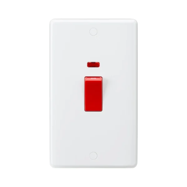 The Knightsbridge 45A 2G DP Red Rocker Switch Neon is designed for safe isolation of high current appliances such as cookers and ovens in domestic and commercial installations.