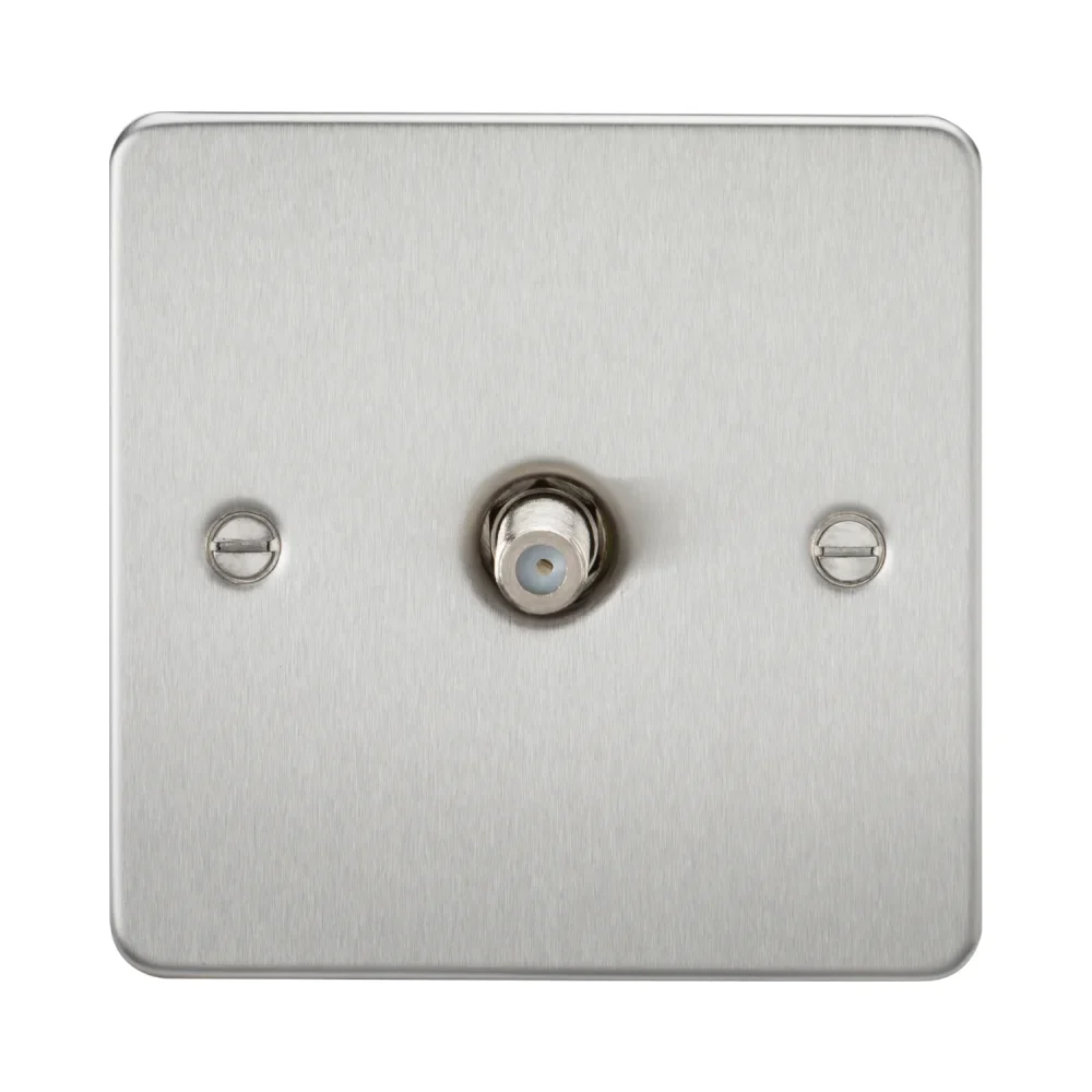 The Knightsbridge FP0150BC Flat Plate 1G SAT TV Outlet (Non-Isolated) in brushed chrome features an F-Type satellite connection, ultra-low profile screwless design, and BS 5733 certification. Ideal for domestic satellite installations requiring a two-way signal.