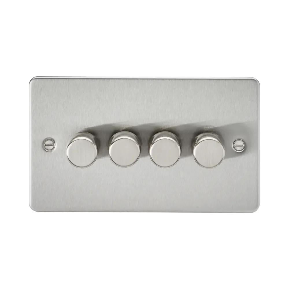 The Knightsbridge FP2184BC Flat Plate 4G 2-Way LED Dimmer is a sleek and practical lighting solution, perfect for modern homes, offices, and commercial spaces. With its ultra-low profile brushed chrome flat plate design, this 4-gang dimmer switch provides smooth, flicker-free dimming for LED and incandescent lighting, helping you create the perfect ambiance in any space.