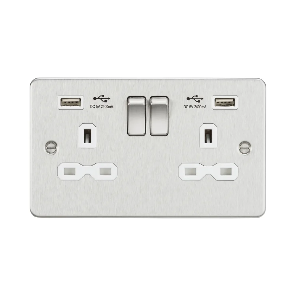 The Knightsbridge FPR9224BCW 13A 2 Gang Switched Socket with Dual USB Charger is a sleek and practical power solution, perfect for modern homes and workplaces. Designed with a low-profile flat plate, this socket features a brushed chrome finish with a white insert, adding a clean, contemporary touch to any space.