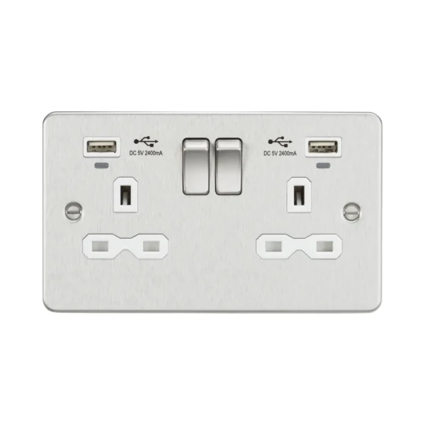 Flat Plate 13A 2G Switched Socket with USB Chargers (2.4A) – Brushed Chrome with White Insert