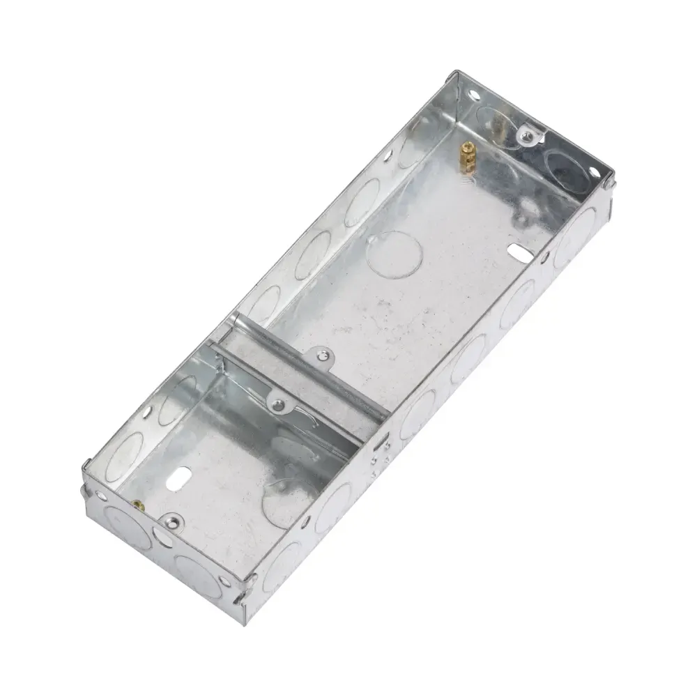 The Knightsbridge GSK335D 3G 35mm Single Plus Double Galvanised Steel Box is designed for mounting two wiring accessory plates side by side, specifically a 1G + 2G configuration. Constructed from 1mm thick galvanised steel, this robust back box ensures durability, corrosion resistance, and long-lasting performance. Featuring 20mm knockouts, earth terminals, and four fixed mounting lugs, it provides a secure and convenient solution for electrical installations.