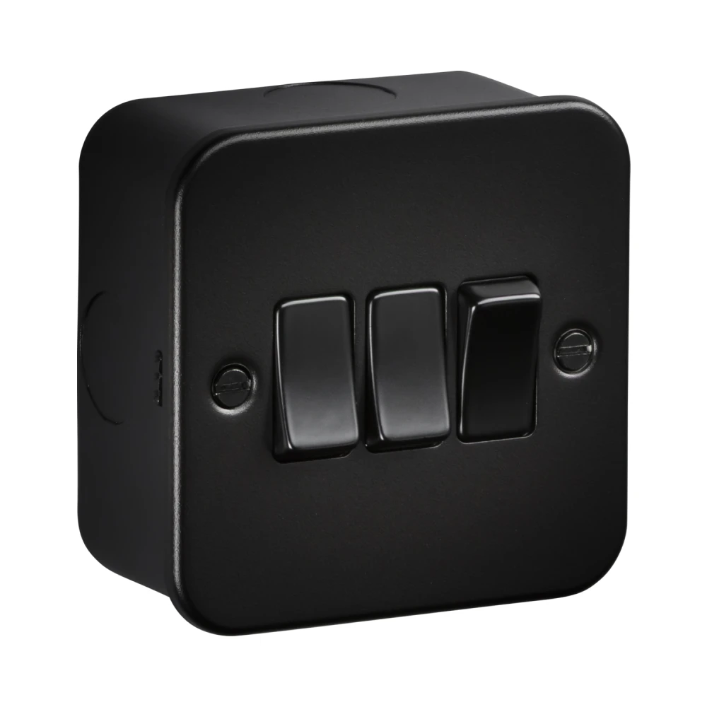 Manufactured to relevant British Standards, the Knightsbridge Black Metal Clad 3 Gang Switch delivers reliable performance in high-traffic indoor settings.