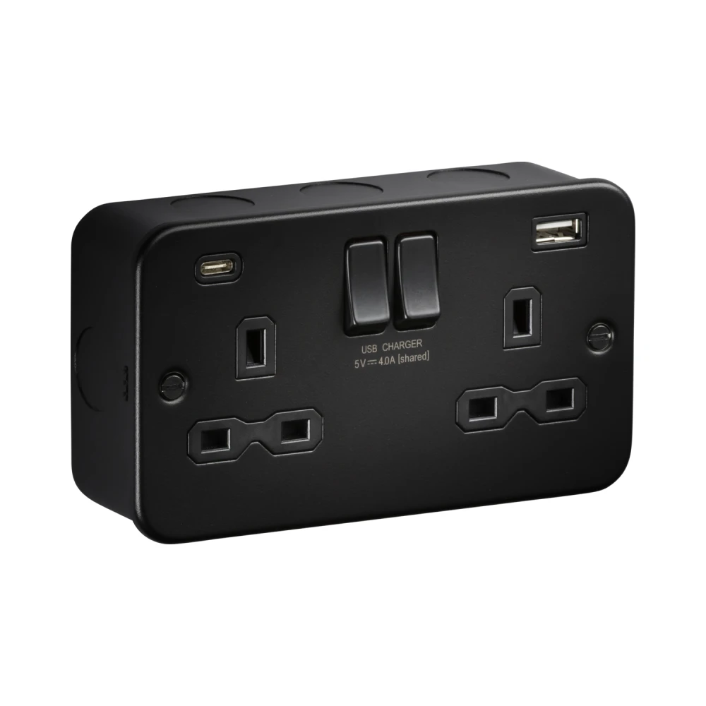 With IP20 protection and manufacture to BS 1363-2, the Knightsbridge Black Metal Clad Double Socket USB A+C is built for reliable everyday use and professional finishes.