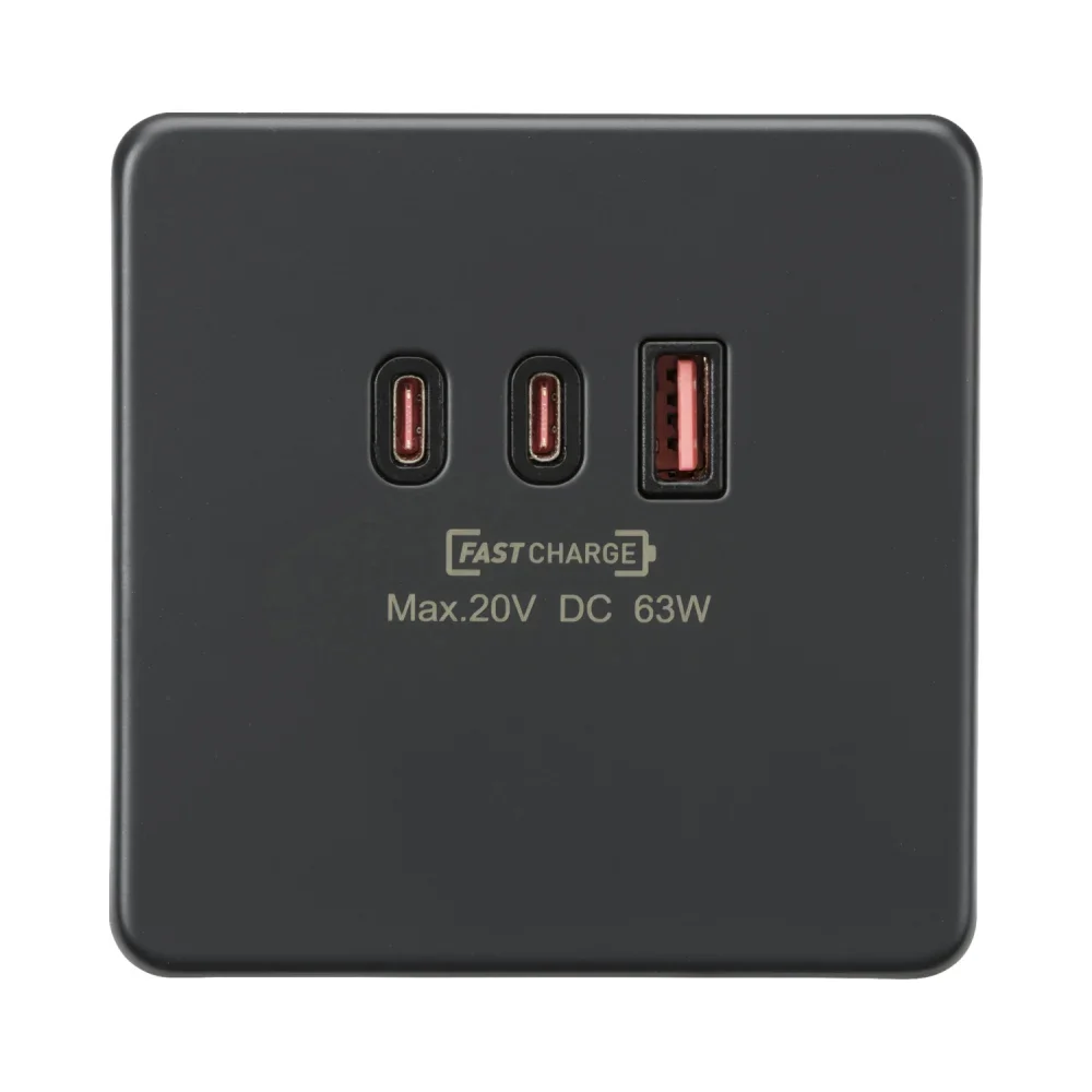 Anthracite 230V Triple USB Charger Plate 2xUSB-C 1xUSB-A [20V DC Max. 63W] with modern anthracite finish and black inserts. Built for durability and perfect for home or office upgrades with clean aesthetics.