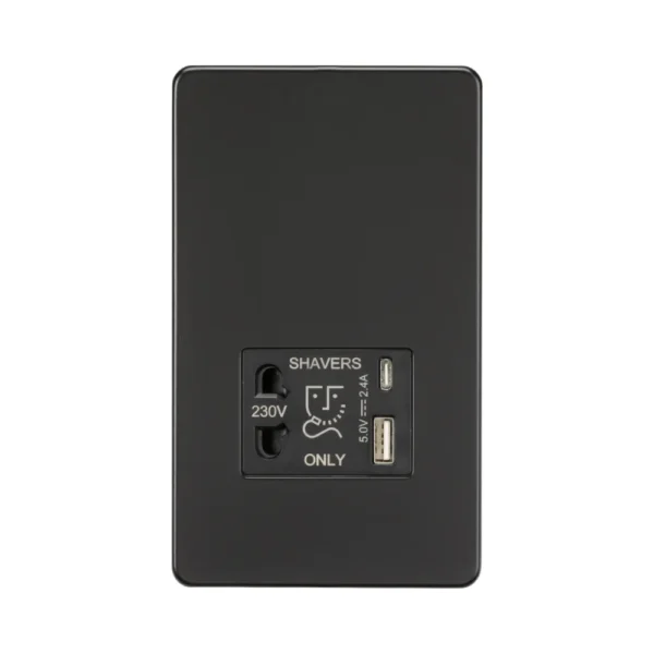 230V Shaver Socket with Dual USB A+C – Matt Black Screwless Design