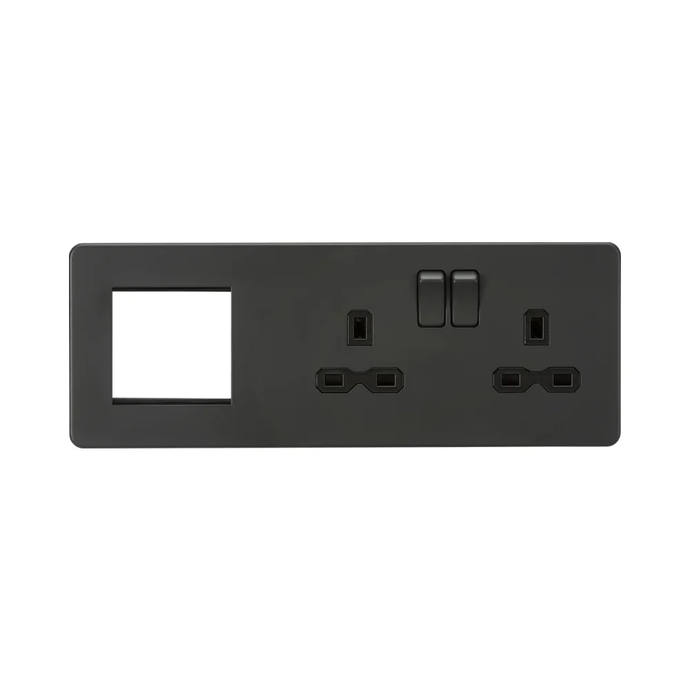 Anthracite 13A 2G DP Socket + 2G Modular Combination Plate with modern anthracite finish and black inserts. Built for durability and perfect for home or office upgrades with clean aesthetics.