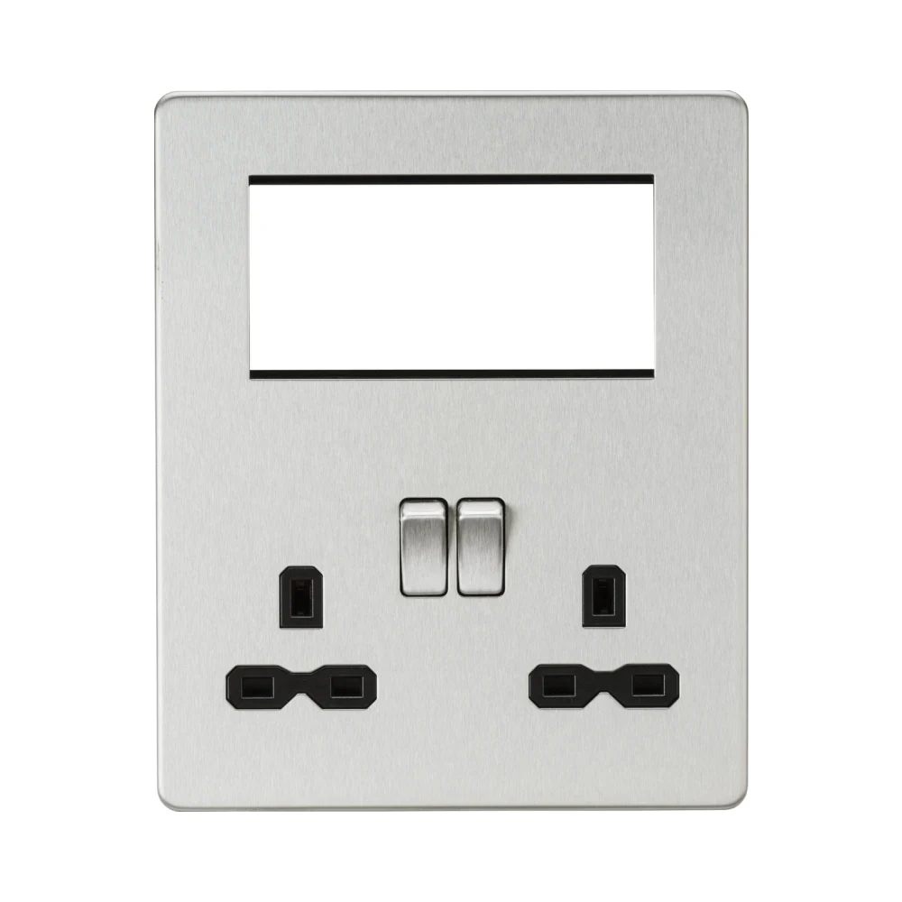 The Knightsbridge SFR194BC Screwless Small Multimedia Combination Plate – Brushed Chrome with Black Insert is a compact and versatile power and signal distribution solution, perfect for modern homes, offices, and renovations. Featuring a 13A double socket, space for up to 4 Euro module inserts (25x50mm), and a stylish brushed chrome screwless design, this customisable multimedia plate supports TV, networking, satellite, USB charging, and telecom applications.