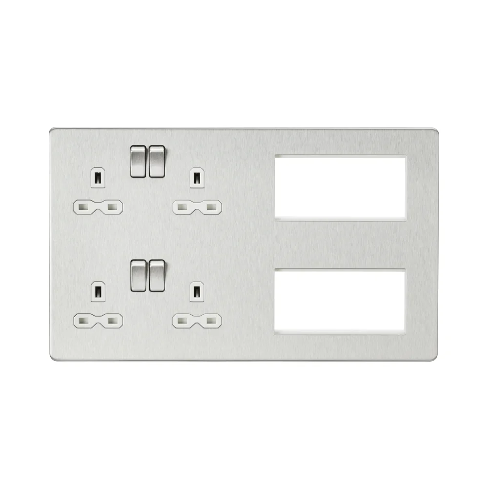 The Knightsbridge SFR298BCW Screwless Combination Plate – Brushed Chrome with White Insert is a versatile power and signal distribution solution, designed for modern homes, offices, and renovations. Featuring two 13A double sockets, space for up to 8 Euro module inserts (25x50mm), and a stylish brushed chrome finish, this customisable combination plate is perfect for TV, networking, satellite, USB charging, and telecom connections.