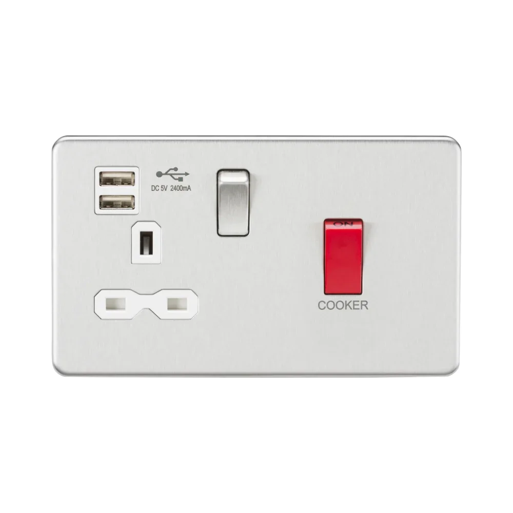 Upgrade your kitchen with the Knightsbridge SFR8333UBCW Cooker Control Unit, which combines a 45A double pole switch, a 13A switched socket, and a built-in dual USB charger (5V DC, 2.4A shared). This screwless, brushed chrome unit with a white insert offers a sleek, space-saving solution for appliance control, socket access, and device charging, all in one stylish fitting.