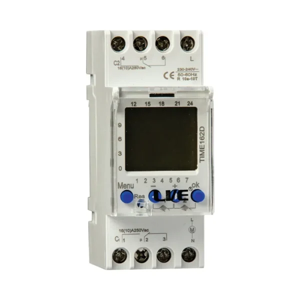 Double-channel digital timer for installation inside of a consumer unit. Ideal for controlling circuits quickly and easily.