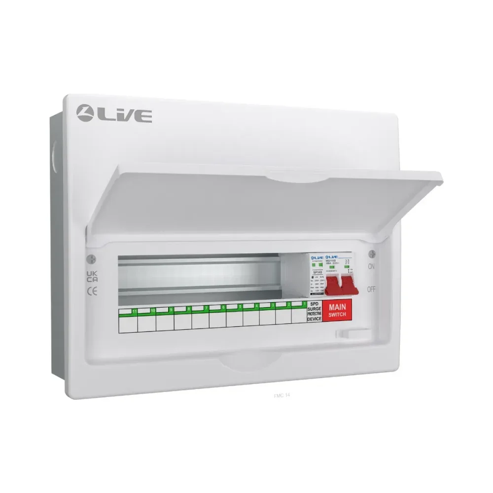 The Live Electrical FMC14M-SP 11 Way Flush SPD Metal Consumer Unit is designed for secure and efficient electrical installations. Featuring a flush-mounted design, the lid sits completely flush when closed, offering a sleek and modern appearance for any environment.