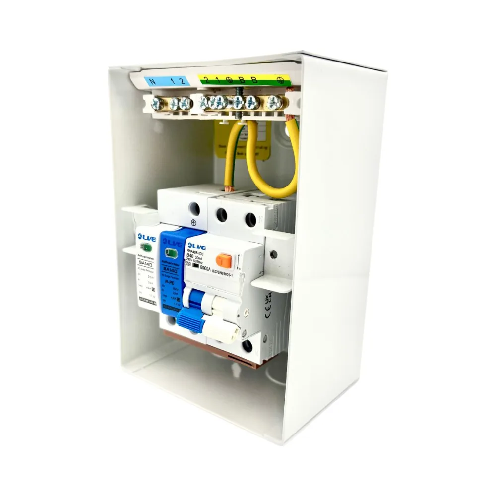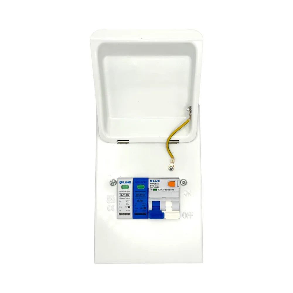 Need a weatherproof unit? Choose the Live Electrical LEV440SP-P. It’s IP65-rated and includes the same 40A C Curve EV-Optimised RCBO and SPD.