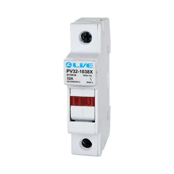 The Live Electrical 32A 1000VDC photovoltaic fuse holder with light supports 10x38mm gPV fuses (not included) and provides visual fuse status indication. A smart, safe choice for DC+ and DC– protection in PV systems.